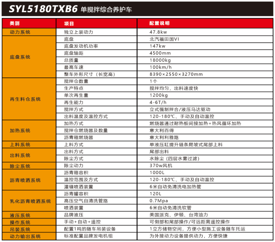 SYL5180TXB6 單攪拌綜合養(yǎng)護(hù)車(chē)是一款集現(xiàn)場(chǎng)生產(chǎn)新瀝青混合料、瀝青路面冷料、 舊料、銑刨料 100%現(xiàn)場(chǎng)加熱再生利用 ,熱瀝青灑布、裂紋跟蹤灌縫、乳化瀝青噴灑、為 其他裝置提供電力和液壓動(dòng)力等多種功能于一體的瀝青路面熱再生綜合養(yǎng)護(hù)車(chē)。可實(shí)現(xiàn)多 場(chǎng)合、多路面的各種類(lèi)養(yǎng)護(hù)作業(yè) ,養(yǎng)護(hù)修補(bǔ)費(fèi)用低 ,作業(yè)快捷 ,高效率、節(jié)能環(huán)保性能突 出等特點(diǎn)。適用于遠(yuǎn)郊較寬闊區(qū)域中小施工量和高速公路的修補(bǔ)施工。