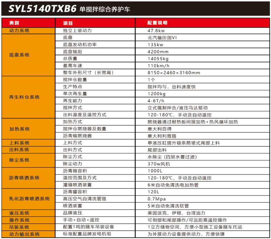 SYL5140TXB6 單攪拌綜合養(yǎng)護(hù)車是一款集現(xiàn)場生產(chǎn)新瀝青混合料、瀝青路面冷料、 舊料、銑刨料100%現(xiàn)場加熱再生利用 ,熱瀝青灑布、裂紋跟蹤灌縫、乳化瀝青噴灑、為其他裝置提供電力和液壓動(dòng)力等多種功能于一體的瀝青路面熱再生綜合養(yǎng)護(hù)車。可實(shí)現(xiàn)多場合、多路面的各種類養(yǎng)護(hù)作業(yè) ,養(yǎng)護(hù)修補(bǔ)費(fèi)用低 ,作業(yè)快捷 ,高效率、節(jié)能環(huán)保性能突